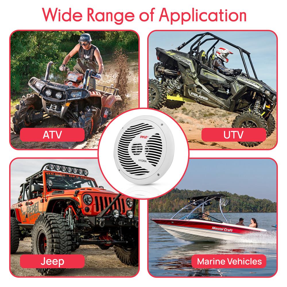 Pyles Hydra series speakers are waterproof and designed for use in your boat on the dock by the pool or simply mounted outside. Theyre designed with rust-proof mesh covers for quality protection. The PLMR60W is a pair of 150-watt 6.5 full-range speaker suitable for marine use. These white speakers are equipped with a polypropylene cone with cloth surround and 1 aluminum voice coil for accurate sound reproduction. The molded ABS plastic basket keeps your sound distortion-free. Package includes mounting hardware and wires.